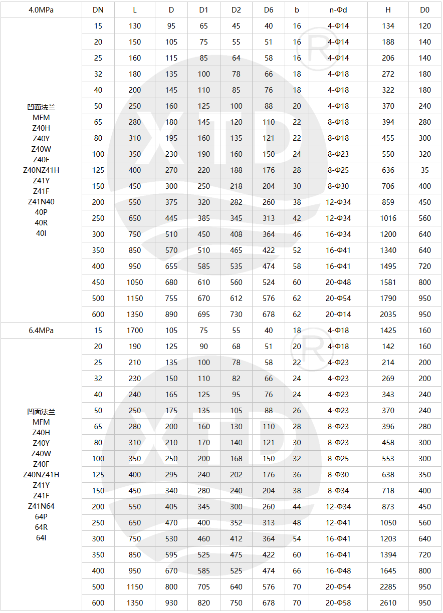 PN4.0MPa~6.4 MPa规格主要尺寸