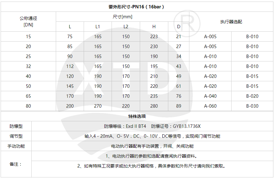 | 执行器选配 | A系列、B系列及进口执行器系列 |